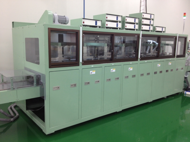 以下の超音波バリ取り装置は、1バレットに100個のノズルをセットして、1槽に3パレット収納、同時に300個のバリ取りをして乾燥させる全自動のバリ取り洗浄乾燥装置です。BMWなどの次世代型噴射ノズル制御部品専用です。