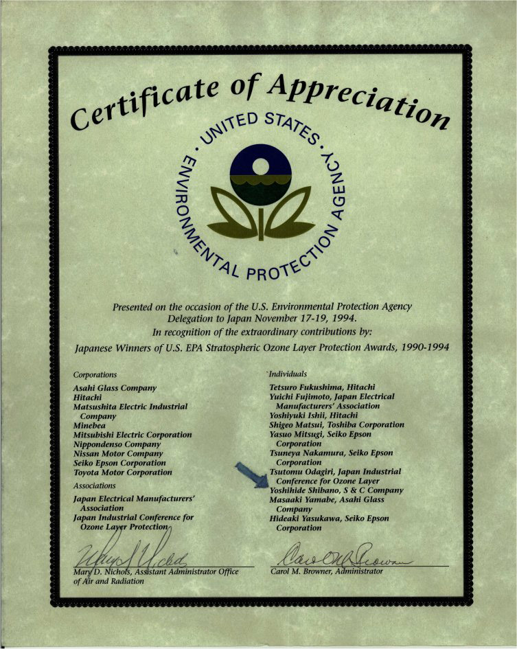 1993年アメリカ環境保護局より、超音波洗浄分野における環境に優しい超音波洗浄技術の普及と開発にはたしたリーダーシップとその技術の実績を認められ成層圏・オゾン保護賞を受賞。