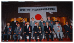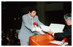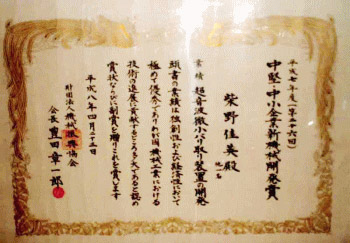 平成7年度の中堅・中小企業新機械開発賞を受賞し、トヨタ自動車会長、豊田章一郎様より賞状と副賞を頂きました。